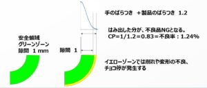 - つまりは、最初に製品設計にて設定された組み合わせの隙間(安全領域:グリーンゾーン)を、①部品公差(部品のばらつき)②設備の動作ばらつきでどれだけ浸食しているか。